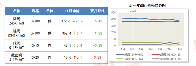11月上半月,加速结构新范畴新赛道,管材、不锈钢板等因为下逛需求持续疲软,对阀门价钱的支持感化削弱。同比下滑2.6%。